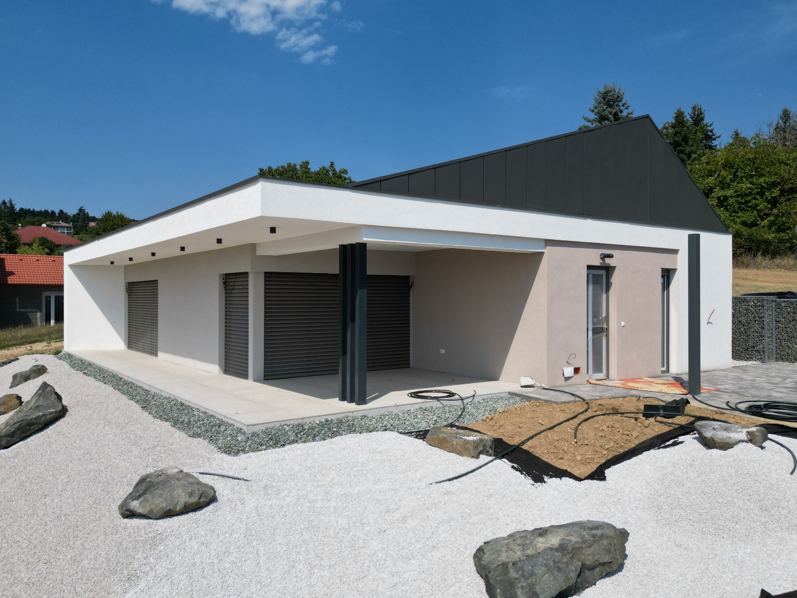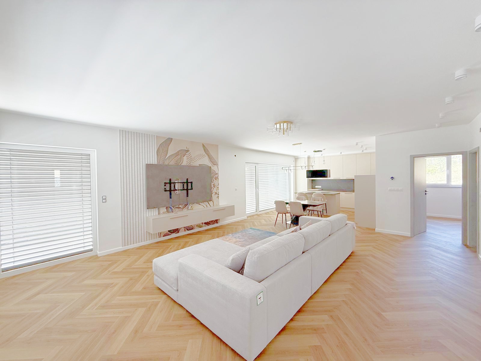 Der lichtdurchflutete Wohn- und Essbereich mit integrierter Küche bildet das Herzstück des Hauses und öffnet sich über große Fensterflächen direkt zu den Terrassen mit zusammen rund 38 m2. Drei Schlafzimmer bieten genügend Platz für die Familie. Ein modern ausgestattetes Badezimmer, separates Gäste-WC, Eingangsbereich sowie ein Hauswirtschafts- bzw. Technikraum sorgen für zusätzlichen Komfort.