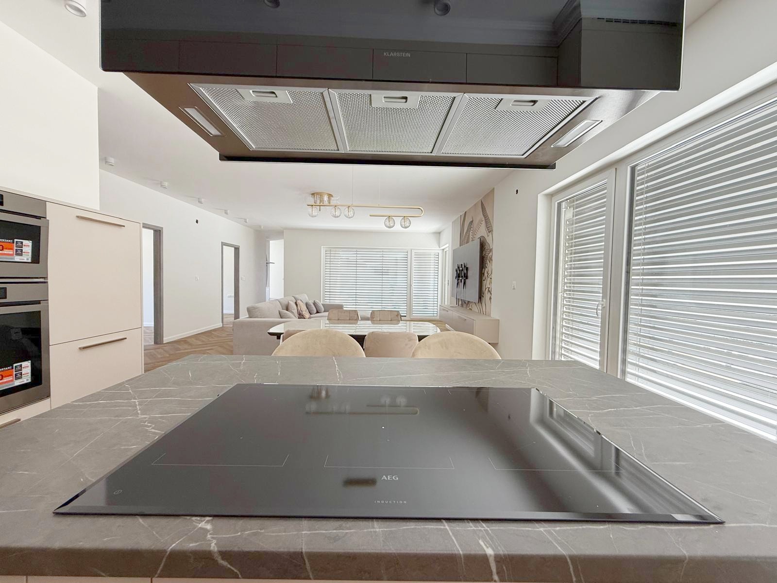 Im Kaufpreis enthalten sind eine hochwertige Einbauküche mit Geräten sowie maßgefertigte Einbaumöbel einschließlich Garderobe im Eingangsbereich. Die Ausstattung ist modern und zeitlos mit pflegeleichten Oberflächen und hochwertigen Materialien.