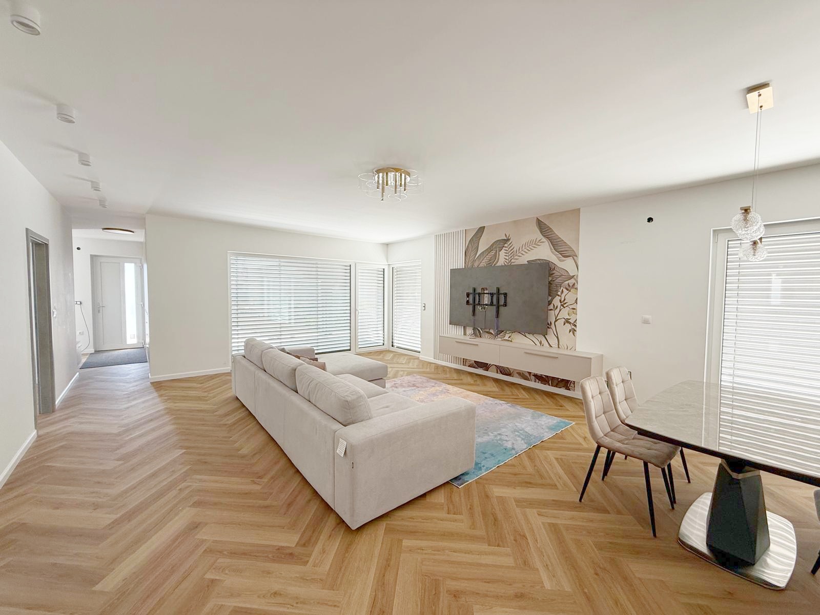 Das Herzstück des Hauses ist der offene Wohn- und Essbereich mit integrierter Küche, der durch große Fensterflächen lichtdurchflutet ist und direkten Zugang zur Terrasse bietet. Drei komfortable Schlafzimmer bieten genügend Platz für die Familie. Zwei modern ausgestattete Badezimmer, ein separates Gäste-WC , Eingangsbereich und ein Hauswirtschafts sorgen für höchsten Wohnkomfort.