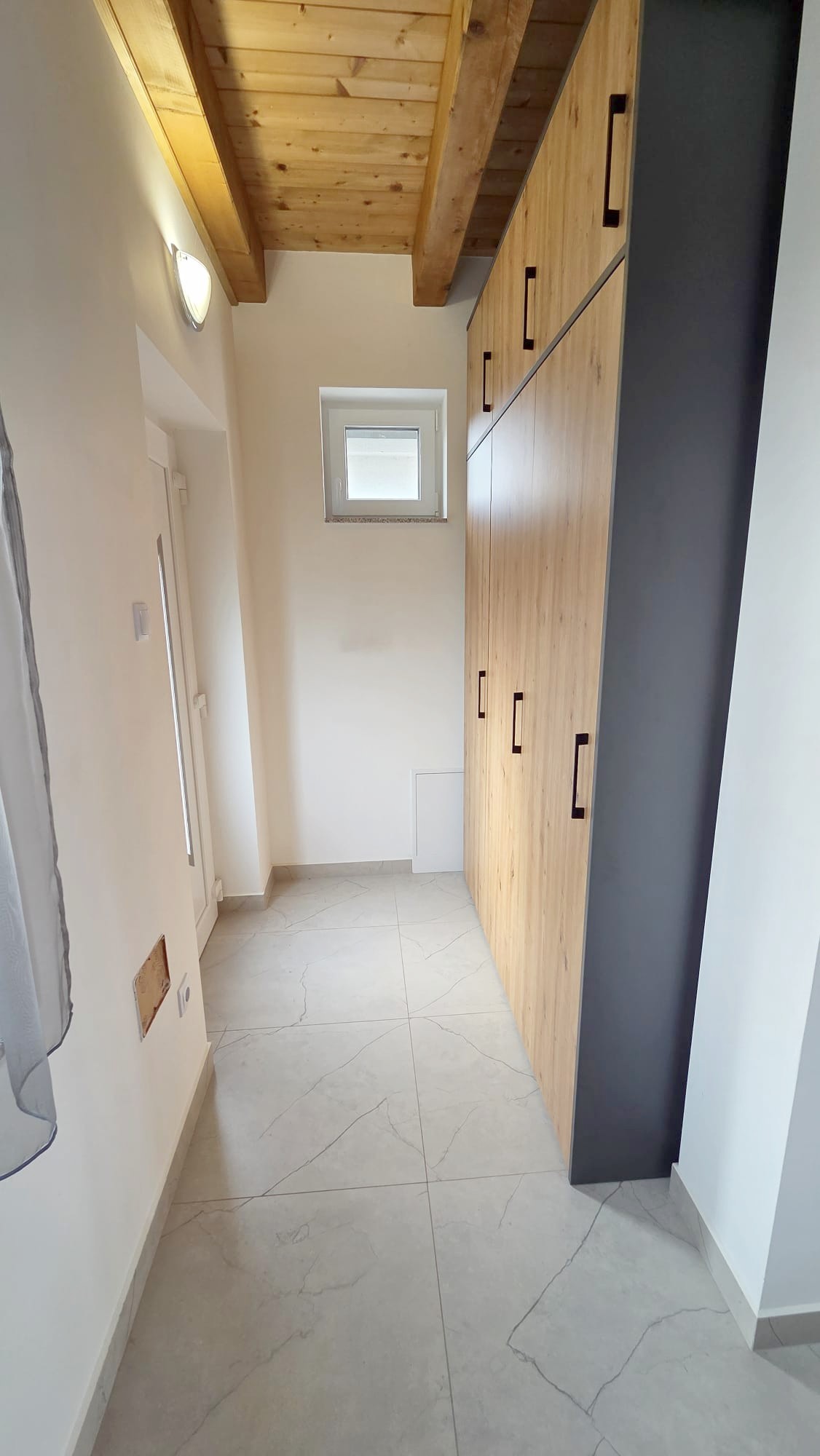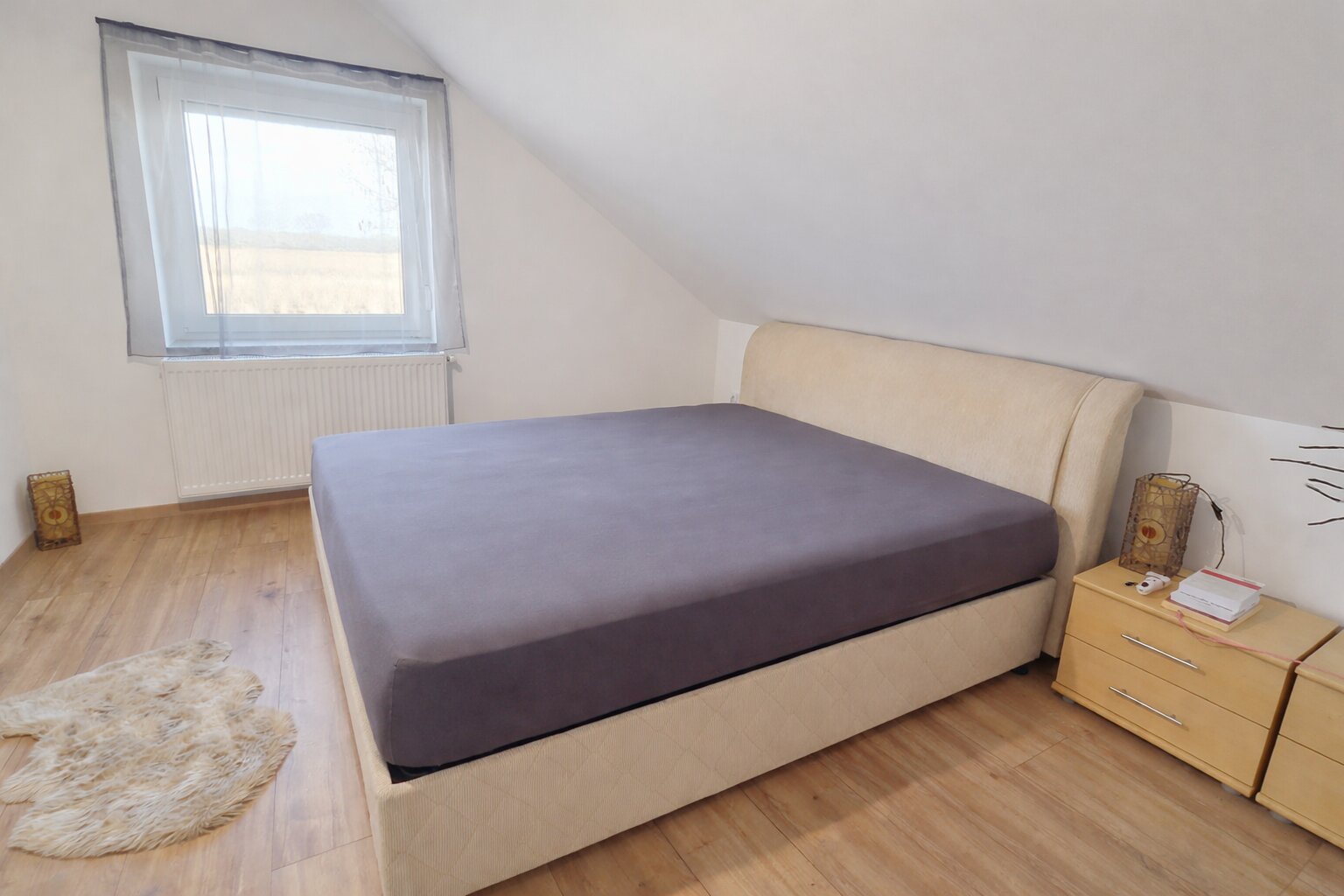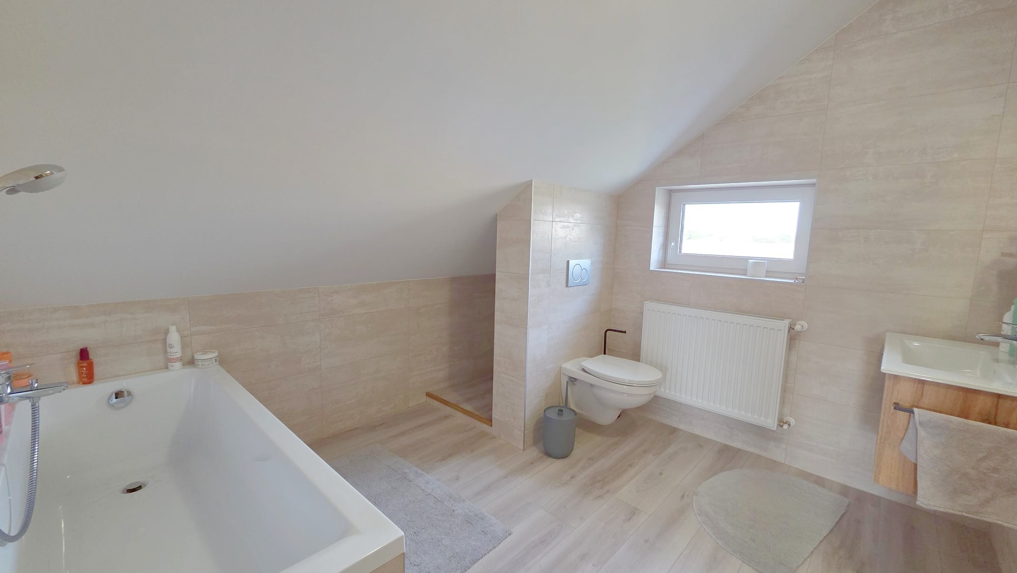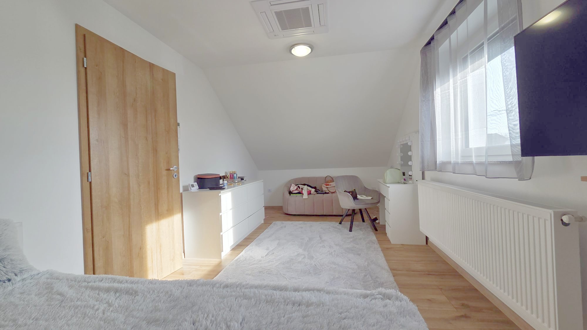 Im Obergeschoss befinden sich zwei weitere Schlafzimmer sowie ein Badezimmer – ideal für Gäste oder Familie. Die sichtbaren Holzbalken im Erdgeschoss verleihen dem Haus eine warme, natürliche Atmosphäre, die perfekt mit dem modernen Interieur harmoniert.