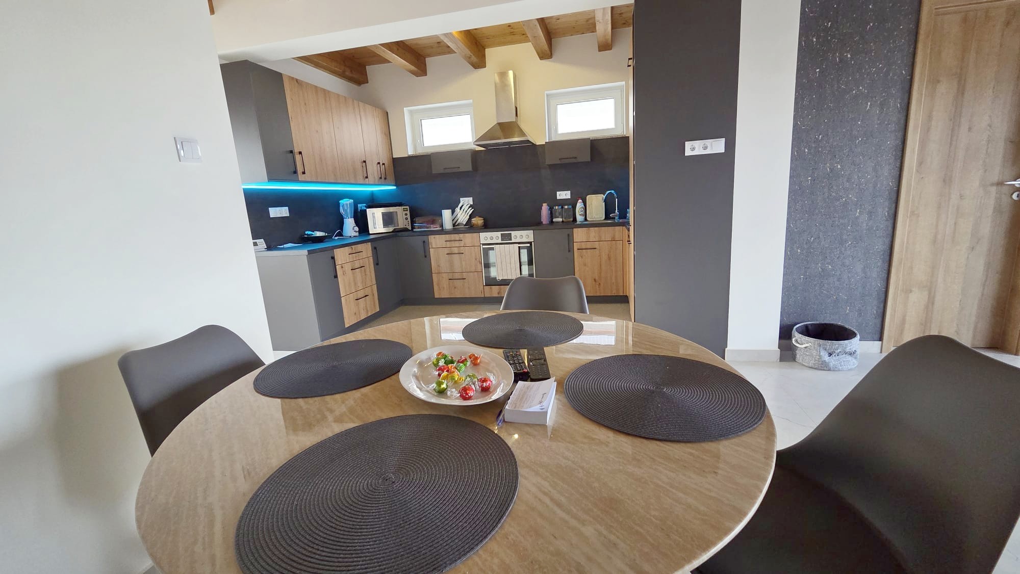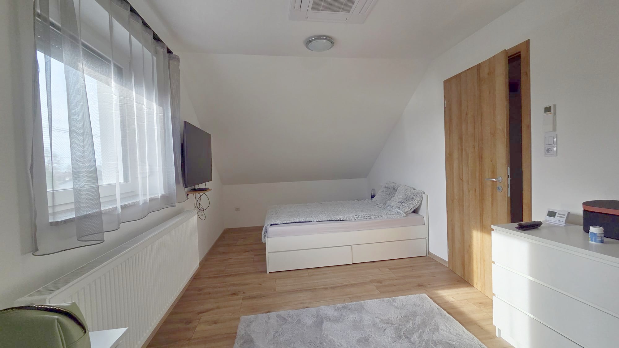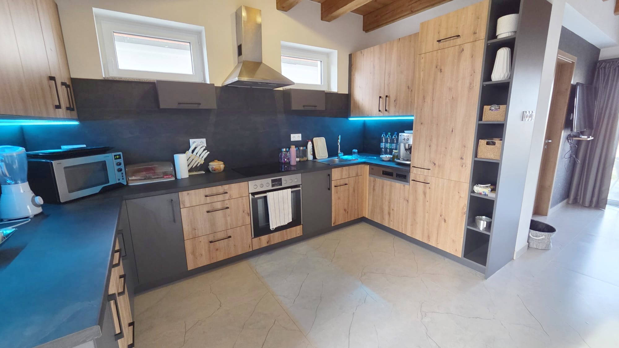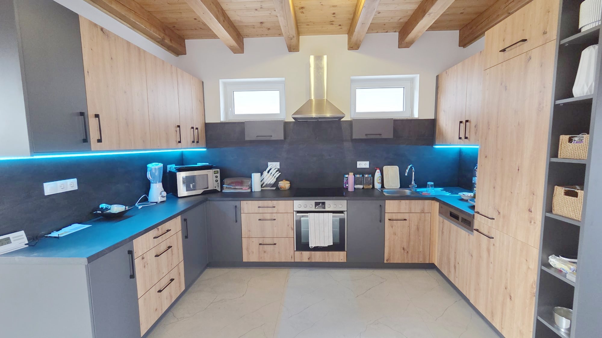 Im Obergeschoss befinden sich zwei weitere Schlafzimmer sowie ein Badezimmer – ideal für Gäste oder Familie. Die sichtbaren Holzbalken im Erdgeschoss verleihen dem Haus eine warme, natürliche Atmosphäre, die perfekt mit dem modernen Interieur harmoniert.