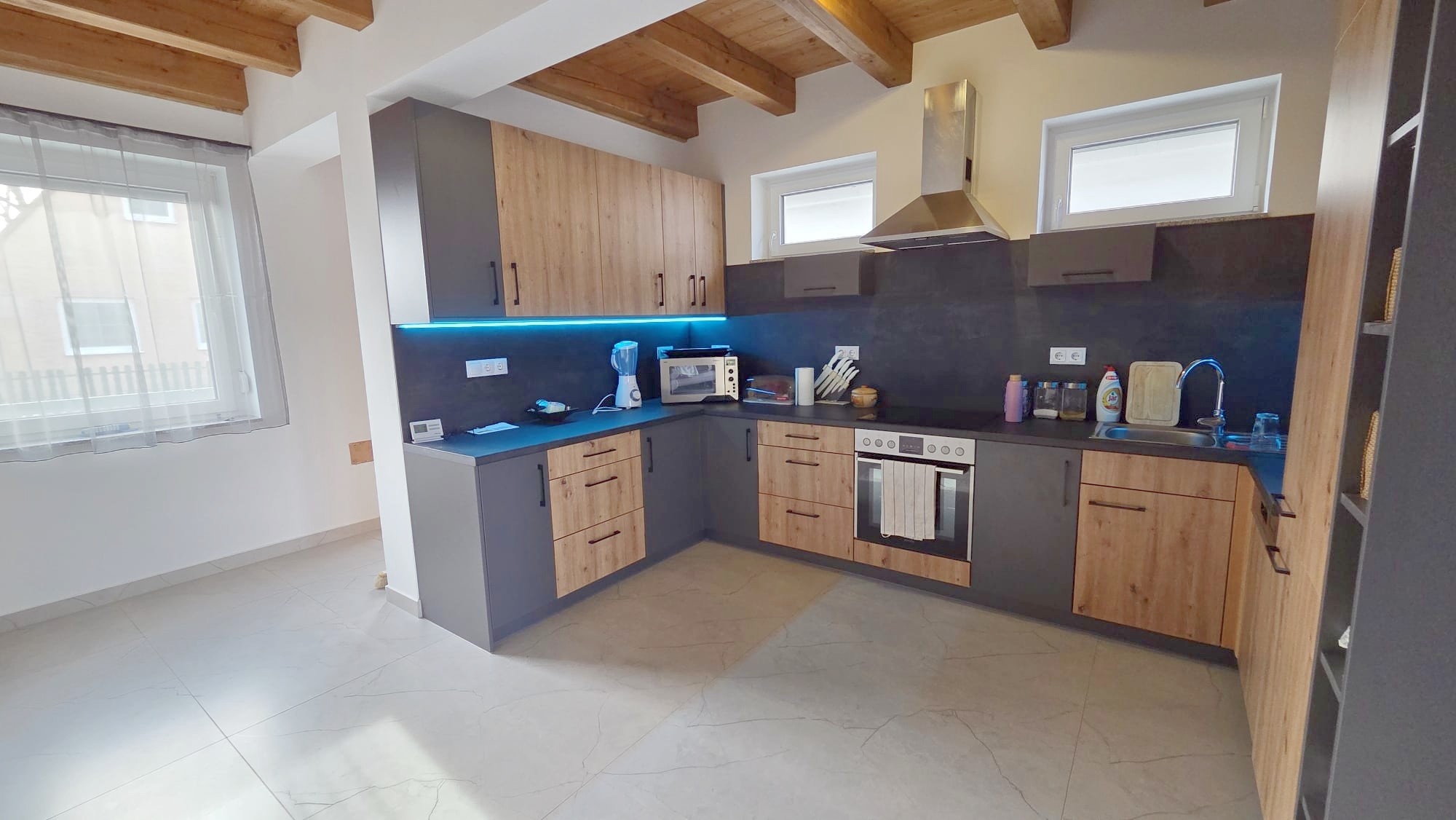 Das moderne, zweistöckige Ziegelhaus wurde mit viel Gespür für Stil und Komfort gestaltet. Im Erdgeschoss erwartet euch ein offener Wohnbereich mit großzügiger Küche und Essplatz, der direkt auf die hintere Terrasse führt – mit Blick auf die Donau. Ergänzt wird diese Ebene durch ein Schlafzimmer und einen Eingangsbereich.