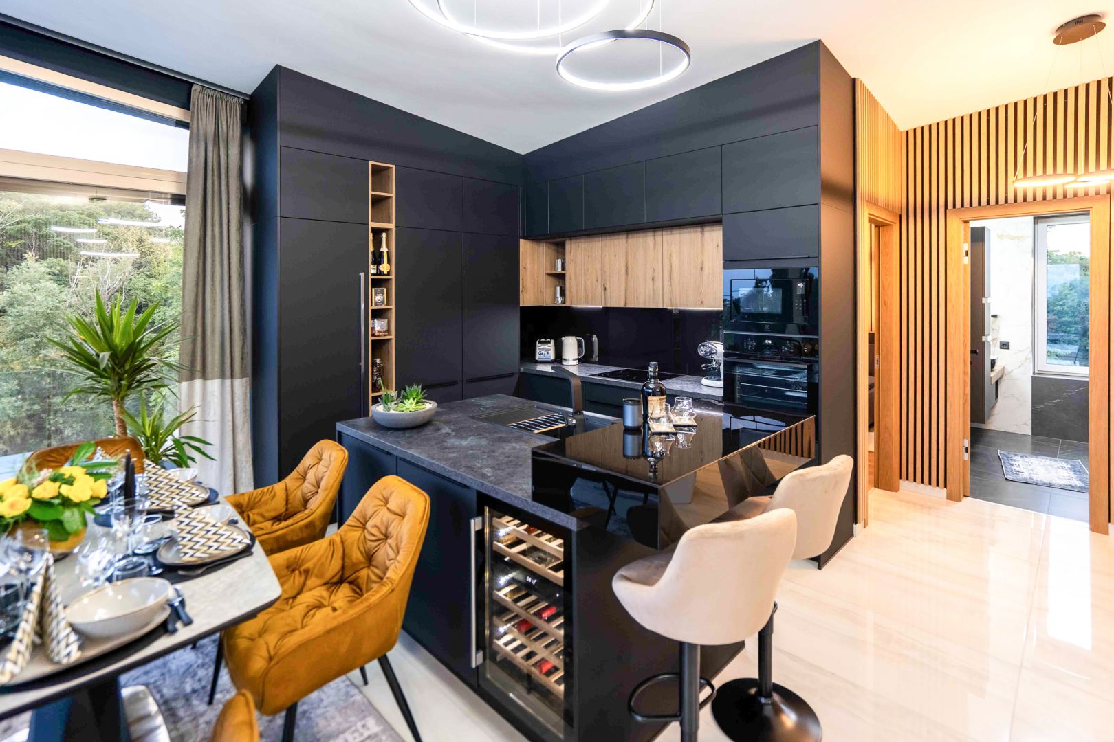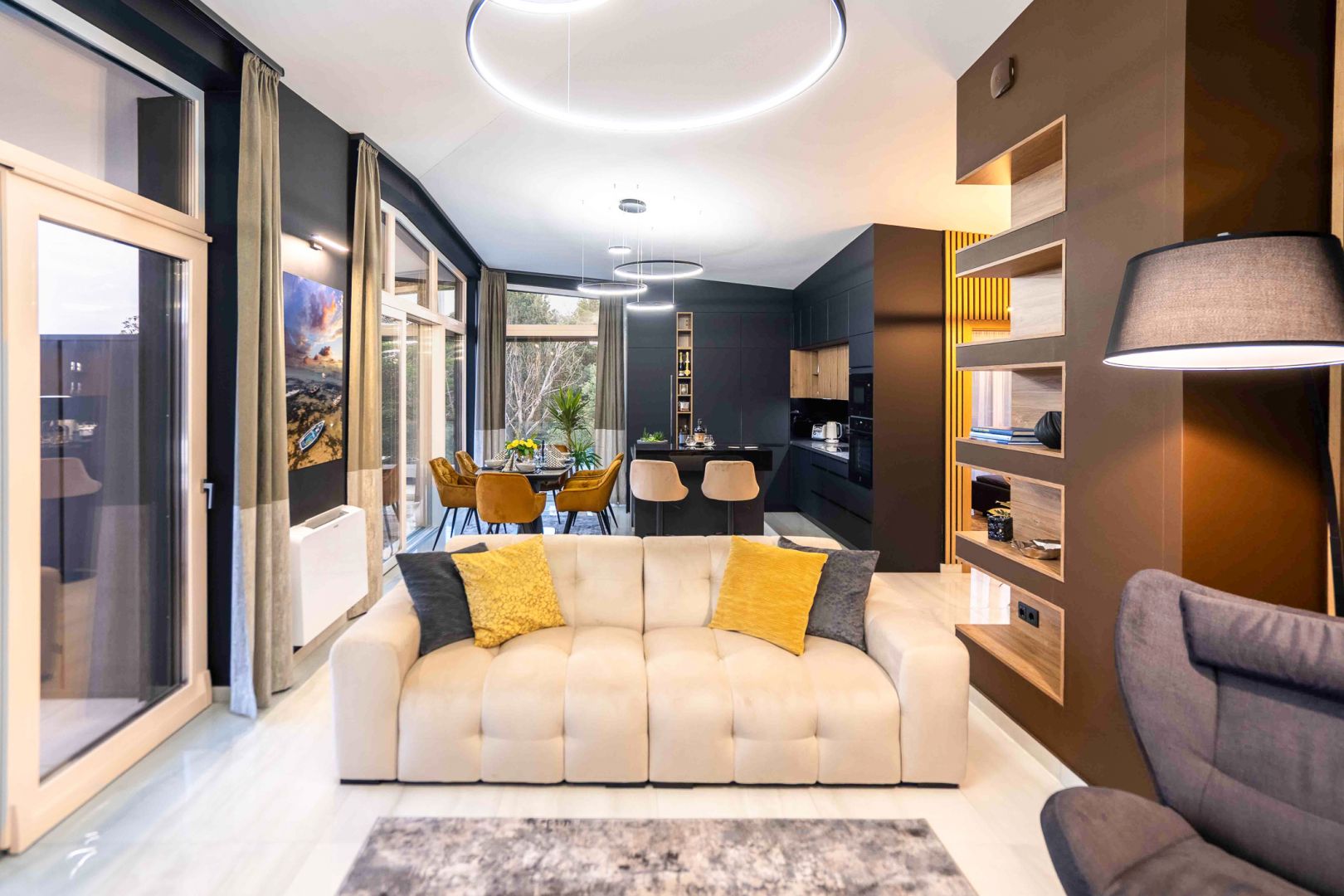 Die durchdachte Raumaufteilung umfasst einen großzügigen Wohnbereich mit offener Küche, mehrere Schlafräume sowie zwei Bäder. Die umlaufende Terrasse ist von drei Seiten zugänglich und eröffnet einen beeindruckenden Blick auf den Balaton sowie auf die angrenzenden Waldflächen. Zur hochwertigen Terrassenausstattung gehören ein Jacuzzi, eine Sauna und komfortable Loungemöbel.