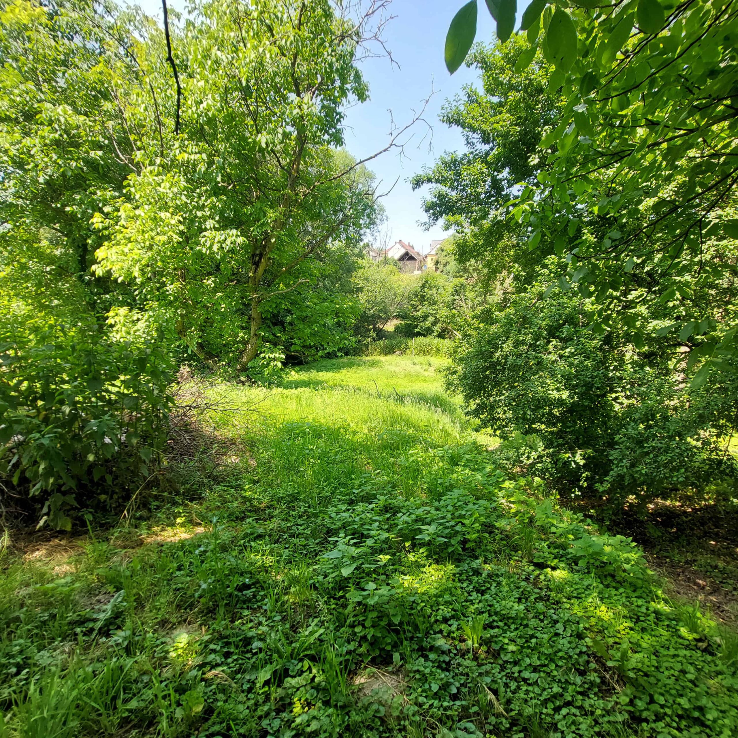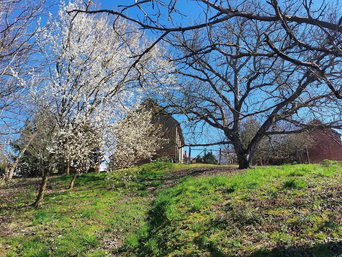 Schattiger, lauschiger Garten mit alten Obstbäumen, Pfirsich, Sauerkirschen, Nussbäume, Mirabellen.