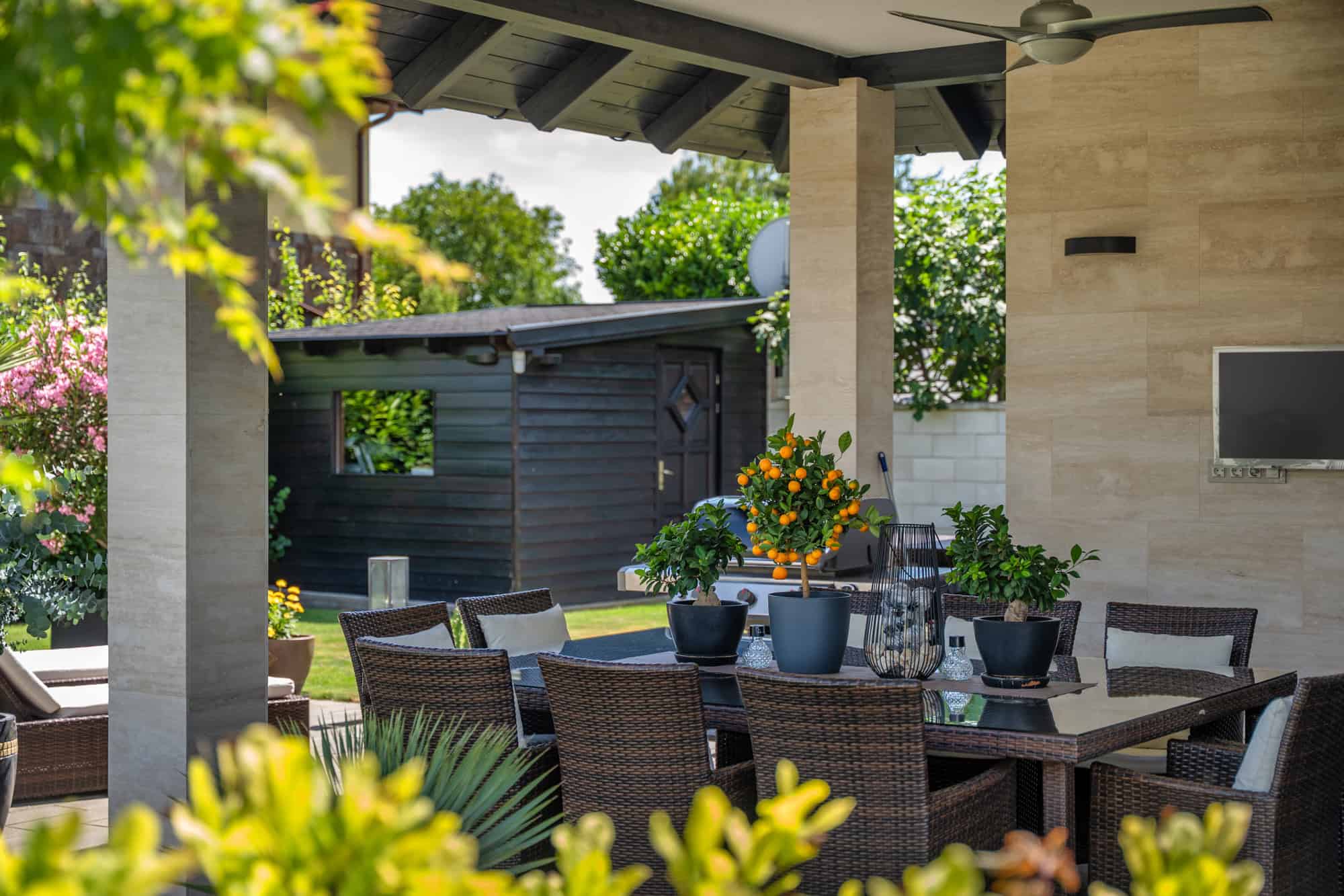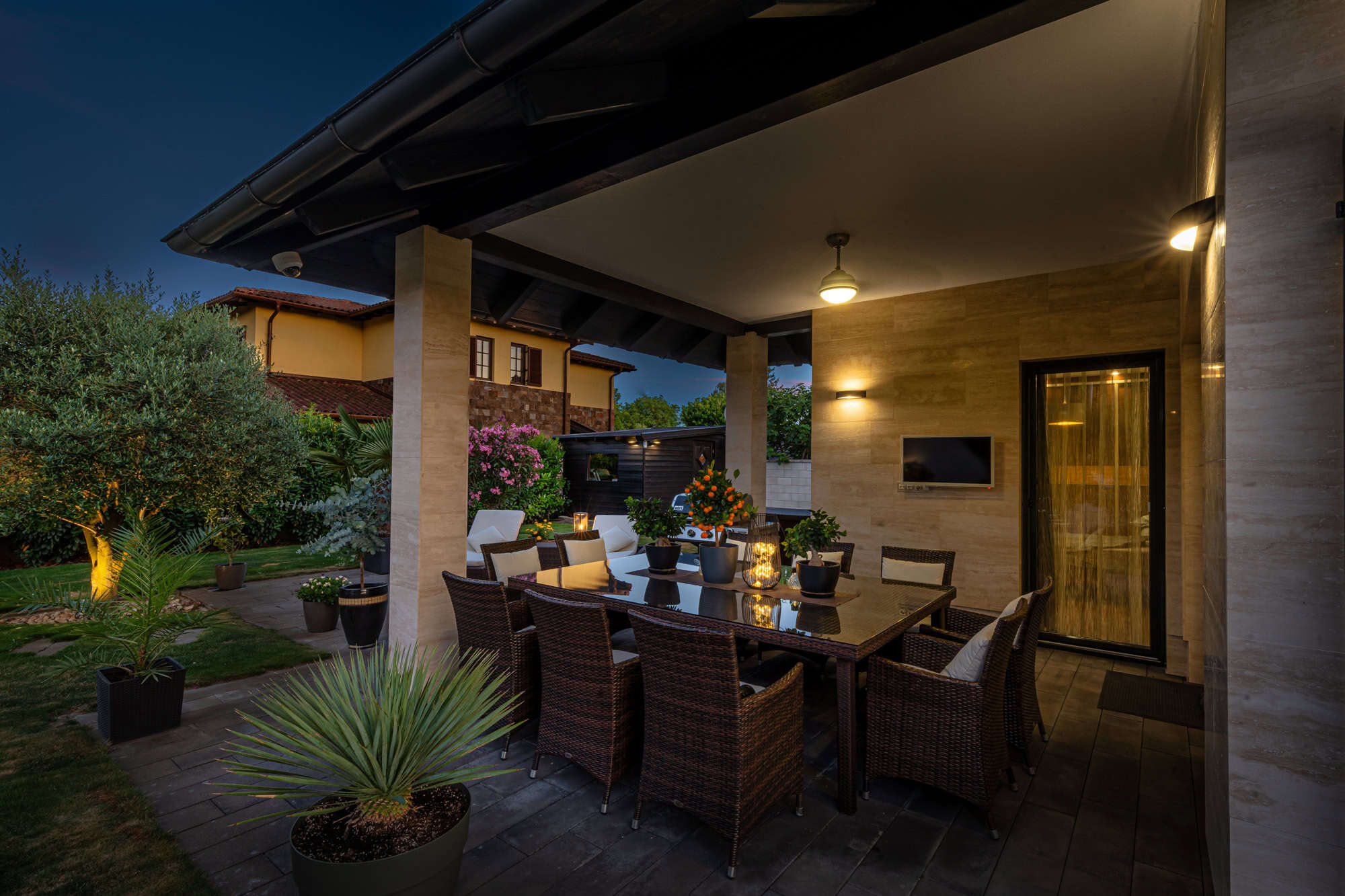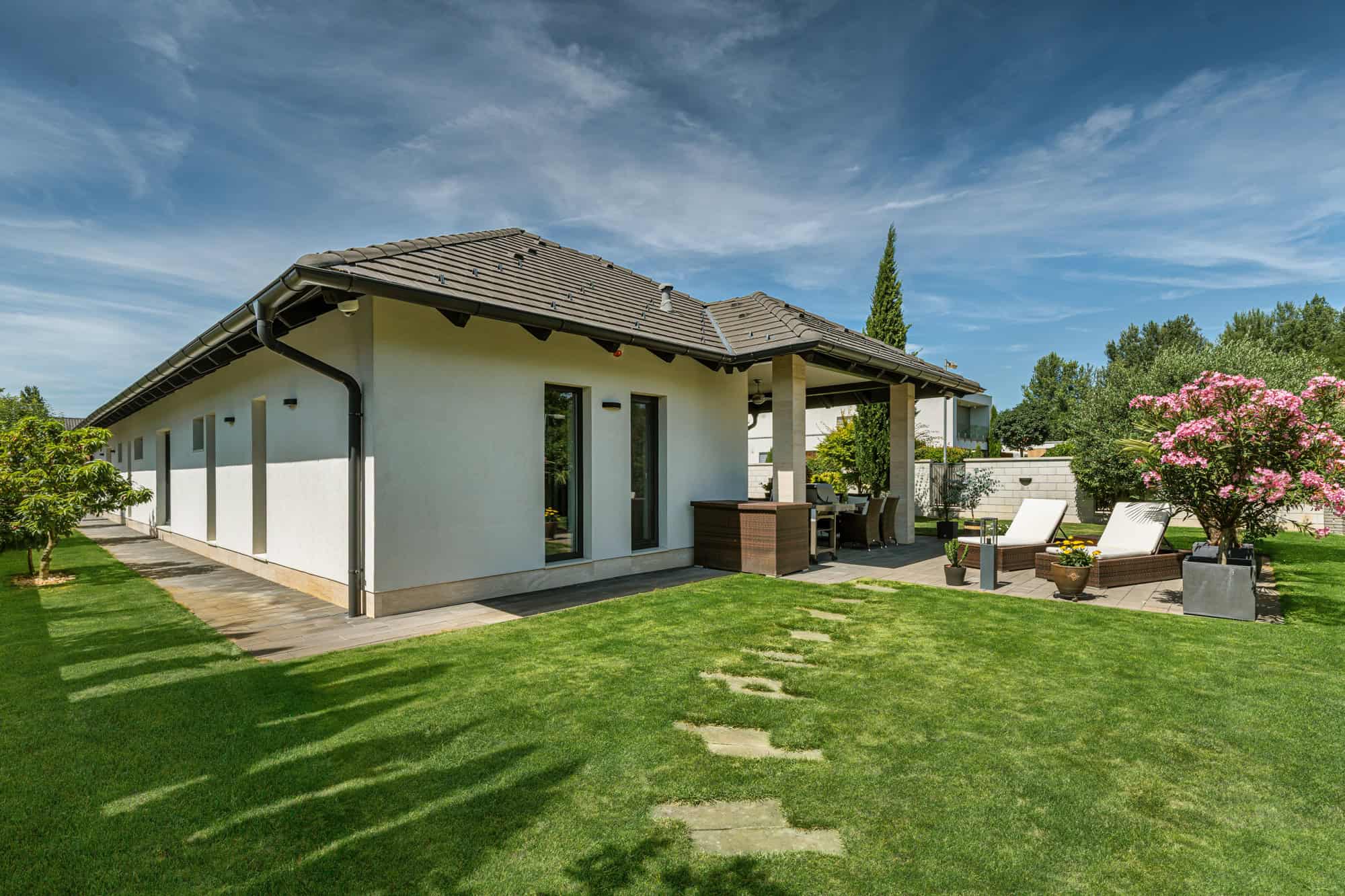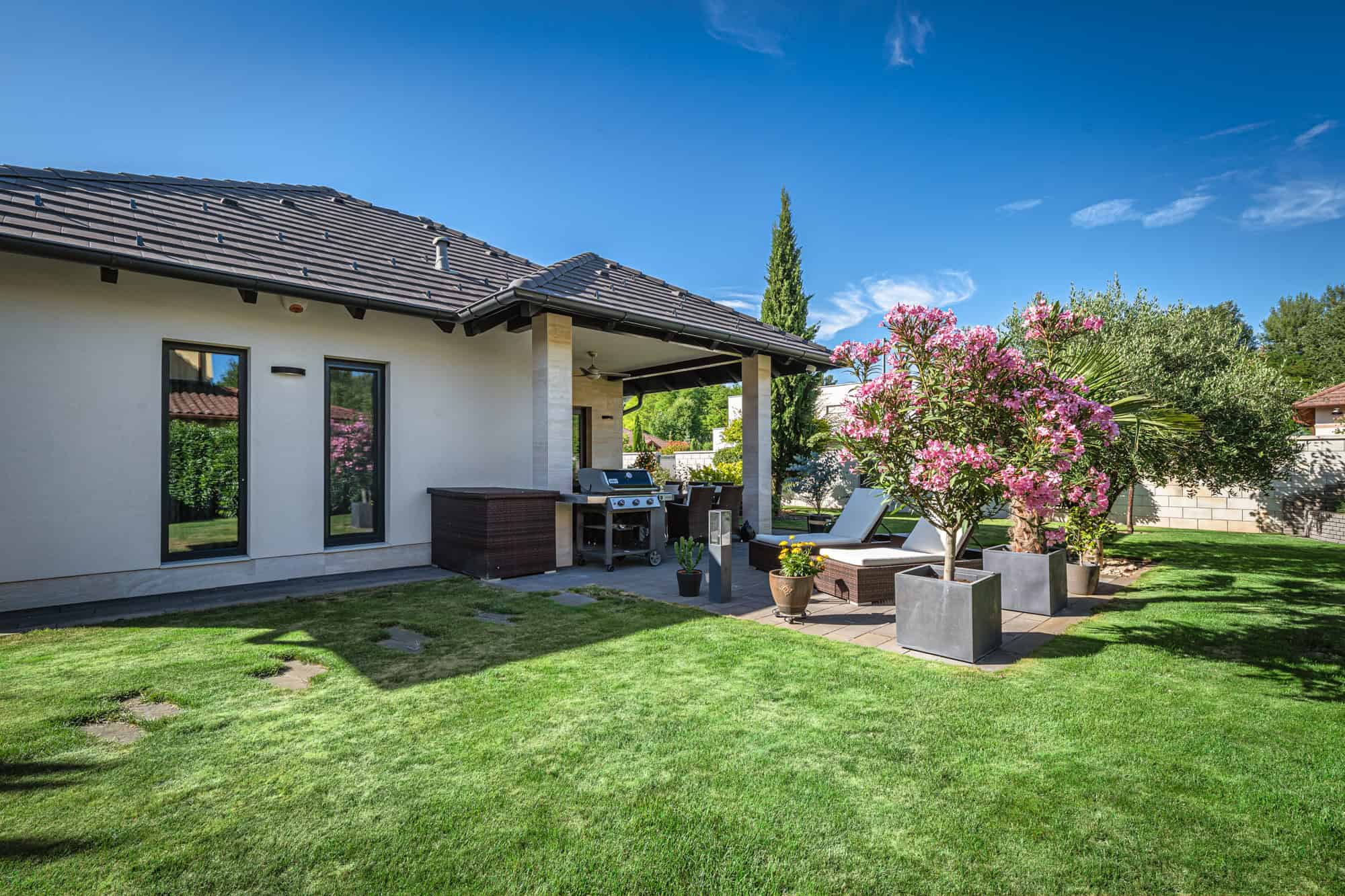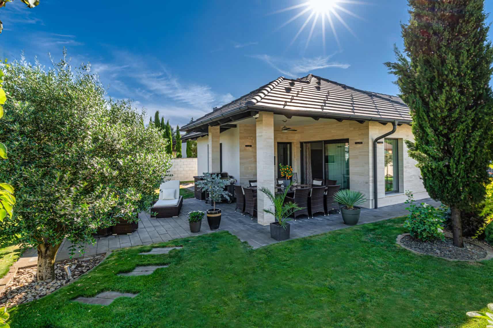 Das Haus verfügt über insgesamt fünf großzügige Zimmer, darunter vier Schlafzimmer und ein offenes, lichtdurchflutetes Wohnzimmer mit integrierter Designküche (Dan), perfekt für gesellige Abende. Zwei stilvoll ausgestattete Badezimmer – eines davon mit einer exklusiven finnischen Sauna für vier Personen – sorgen für Wellness-Atmosphäre im eigenen Zuhause. Der direkte Zugang zur überdachten Terrasse mit Platz für zehn Personen lädt zum entspannten Speisen im Freien ein, während der liebevoll gestaltete Garten mit mediterranen Pflanzen, darunter Palmen und Olivenbäume, ein echtes Urlaubsgefühl vermittelt.