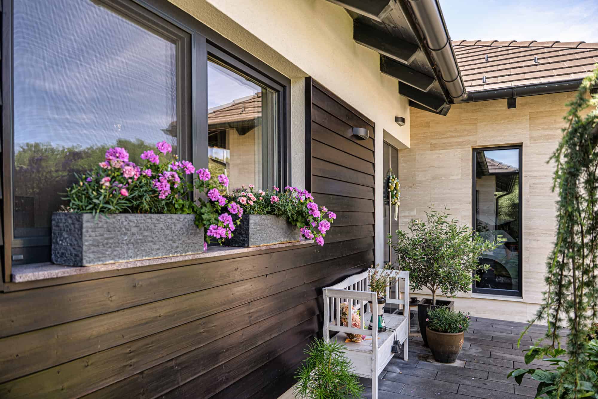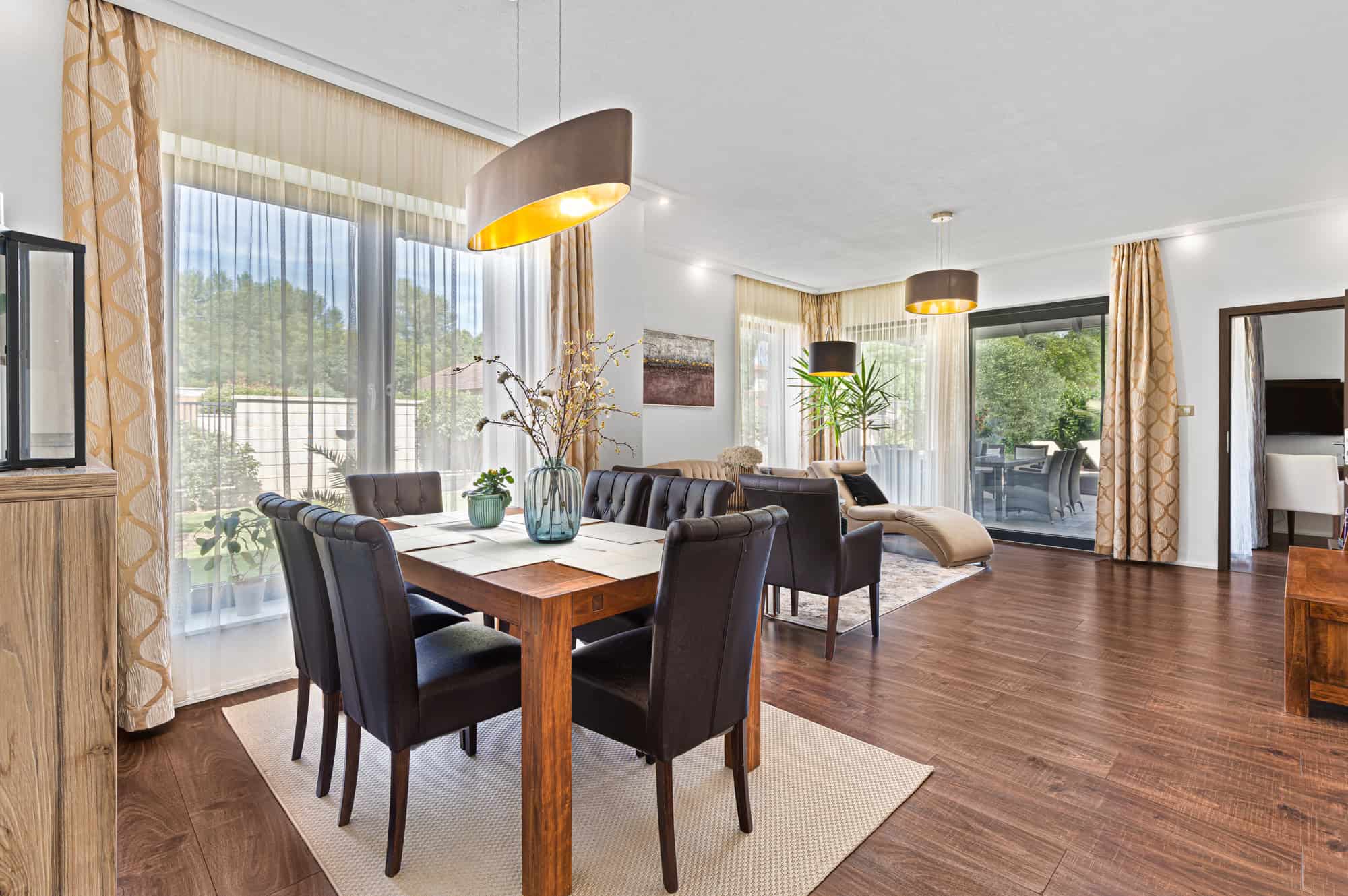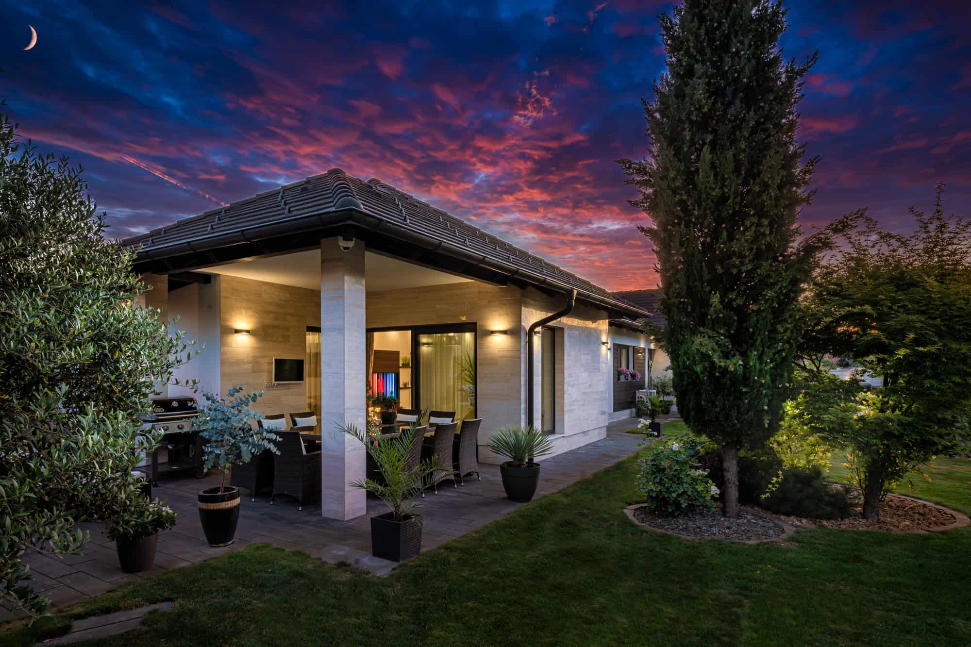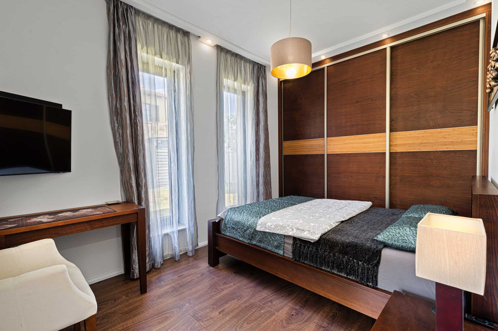 Das Haus verfügt über insgesamt fünf großzügige Zimmer, darunter vier Schlafzimmer und ein offenes, lichtdurchflutetes Wohnzimmer mit integrierter Designküche (Dan), perfekt für gesellige Abende. Zwei stilvoll ausgestattete Badezimmer – eines davon mit einer exklusiven finnischen Sauna für vier Personen – sorgen für Wellness-Atmosphäre im eigenen Zuhause. Der direkte Zugang zur überdachten Terrasse mit Platz für zehn Personen lädt zum entspannten Speisen im Freien ein, während der liebevoll gestaltete Garten mit mediterranen Pflanzen, darunter Palmen und Olivenbäume, ein echtes Urlaubsgefühl vermittelt.