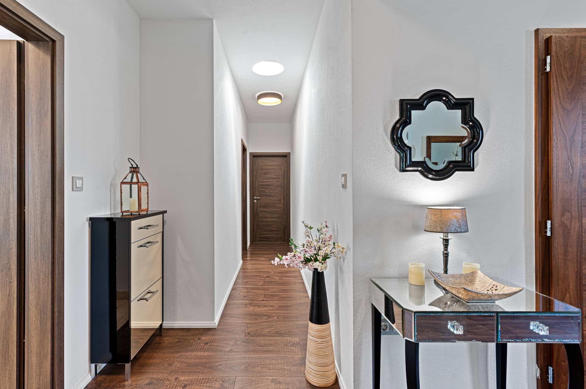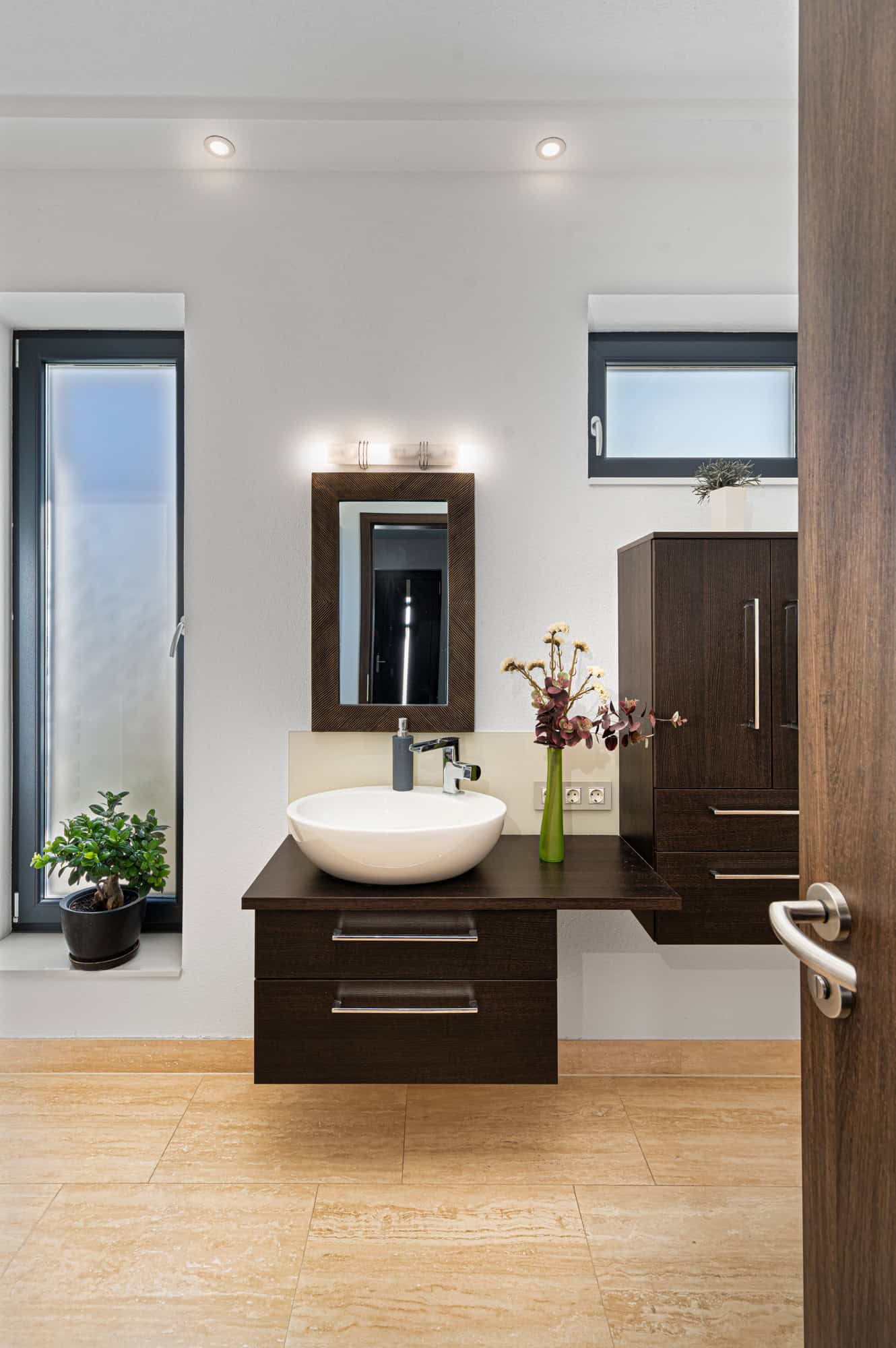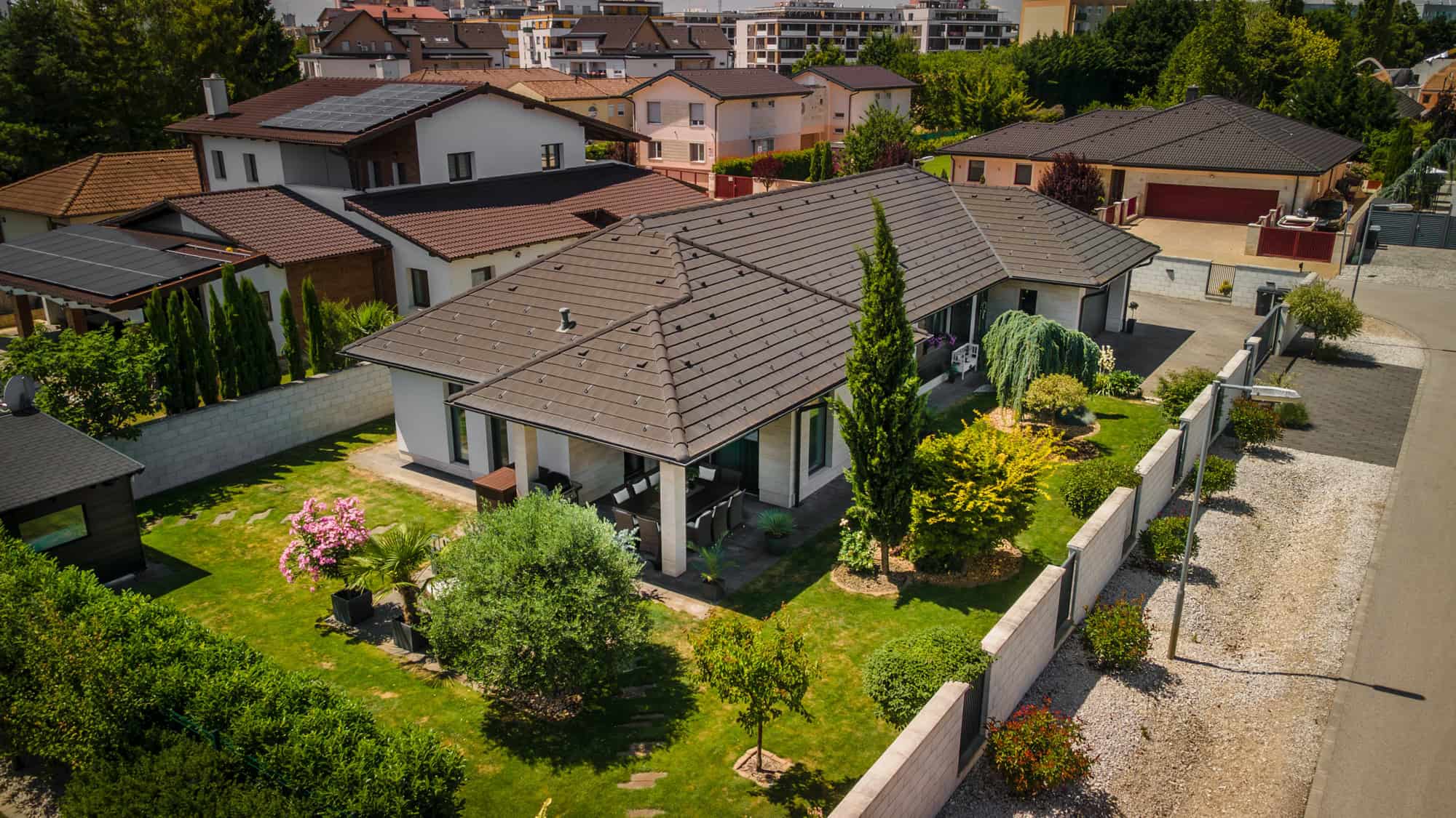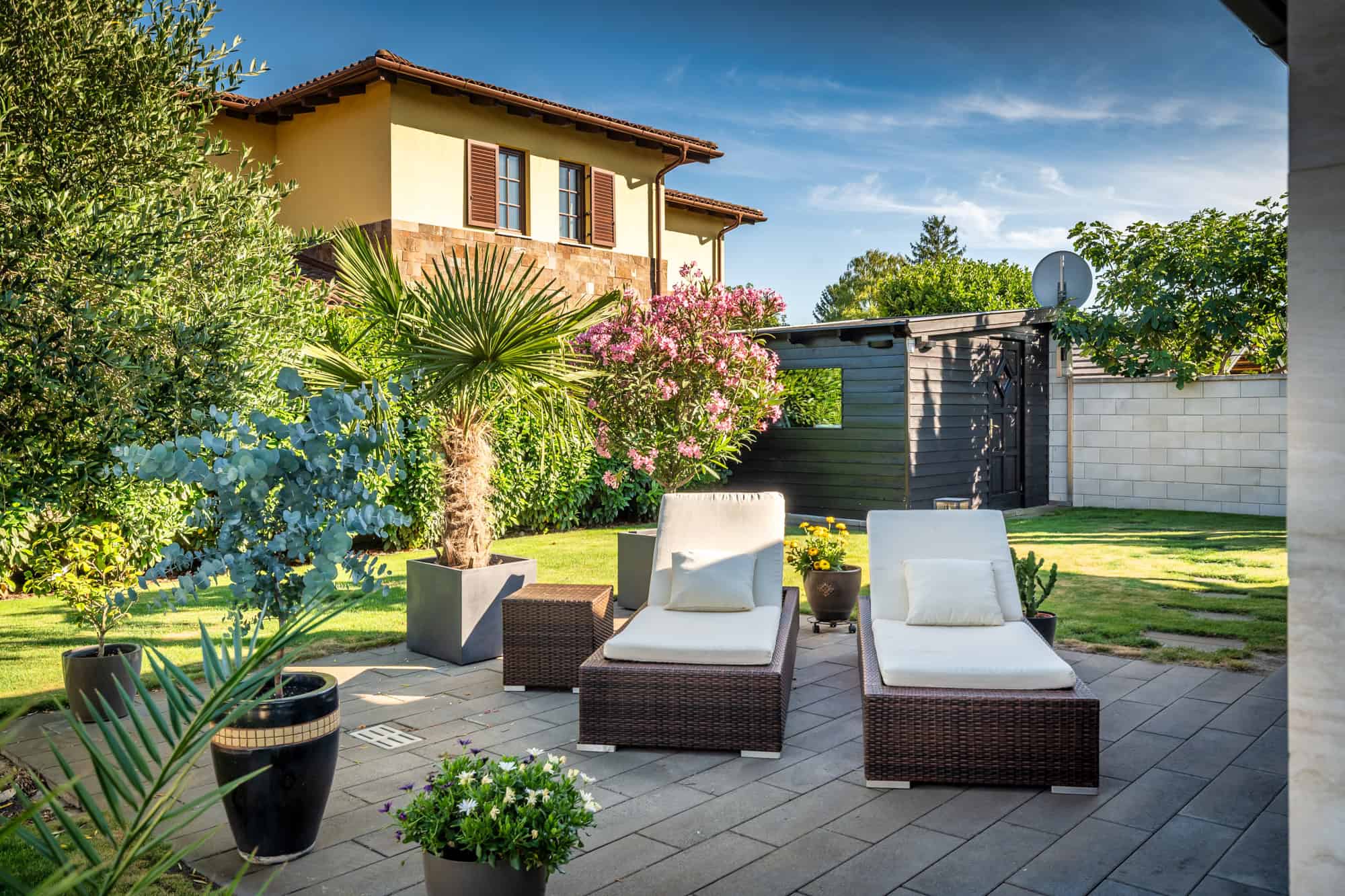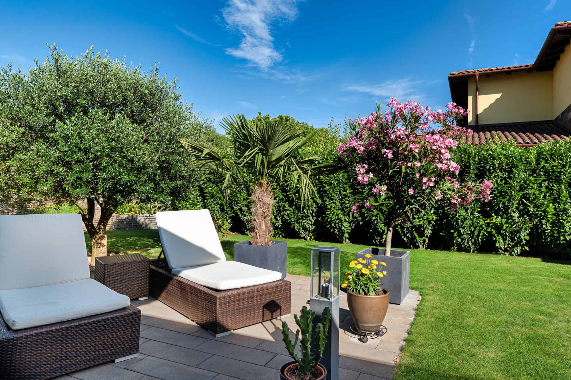 Das Haus verfügt über insgesamt fünf großzügige Zimmer, darunter vier Schlafzimmer und ein offenes, lichtdurchflutetes Wohnzimmer mit integrierter Designküche (Dan), perfekt für gesellige Abende. Zwei stilvoll ausgestattete Badezimmer – eines davon mit einer exklusiven finnischen Sauna für vier Personen – sorgen für Wellness-Atmosphäre im eigenen Zuhause. Der direkte Zugang zur überdachten Terrasse mit Platz für zehn Personen lädt zum entspannten Speisen im Freien ein, während der liebevoll gestaltete Garten mit mediterranen Pflanzen, darunter Palmen und Olivenbäume, ein echtes Urlaubsgefühl vermittelt.