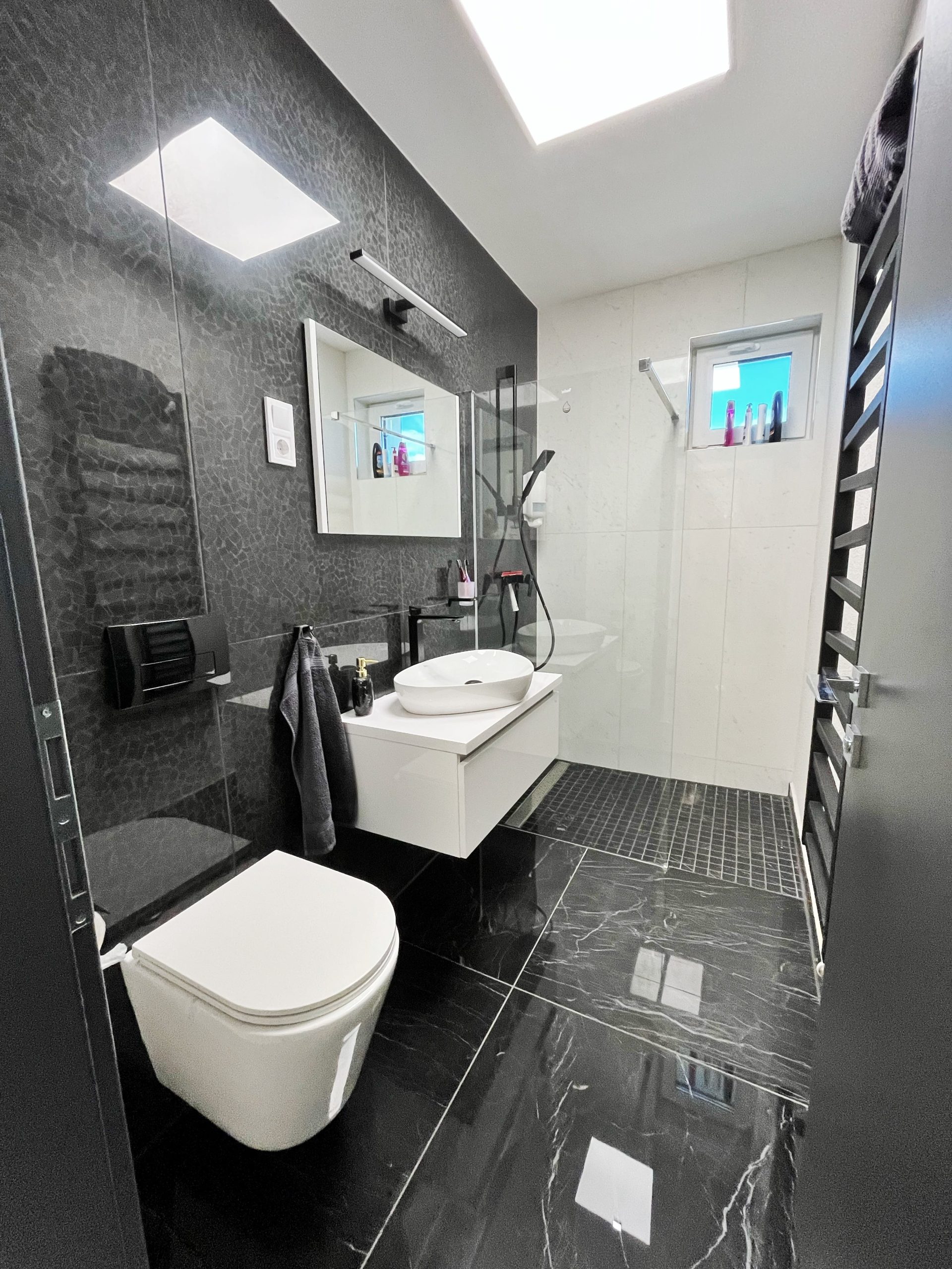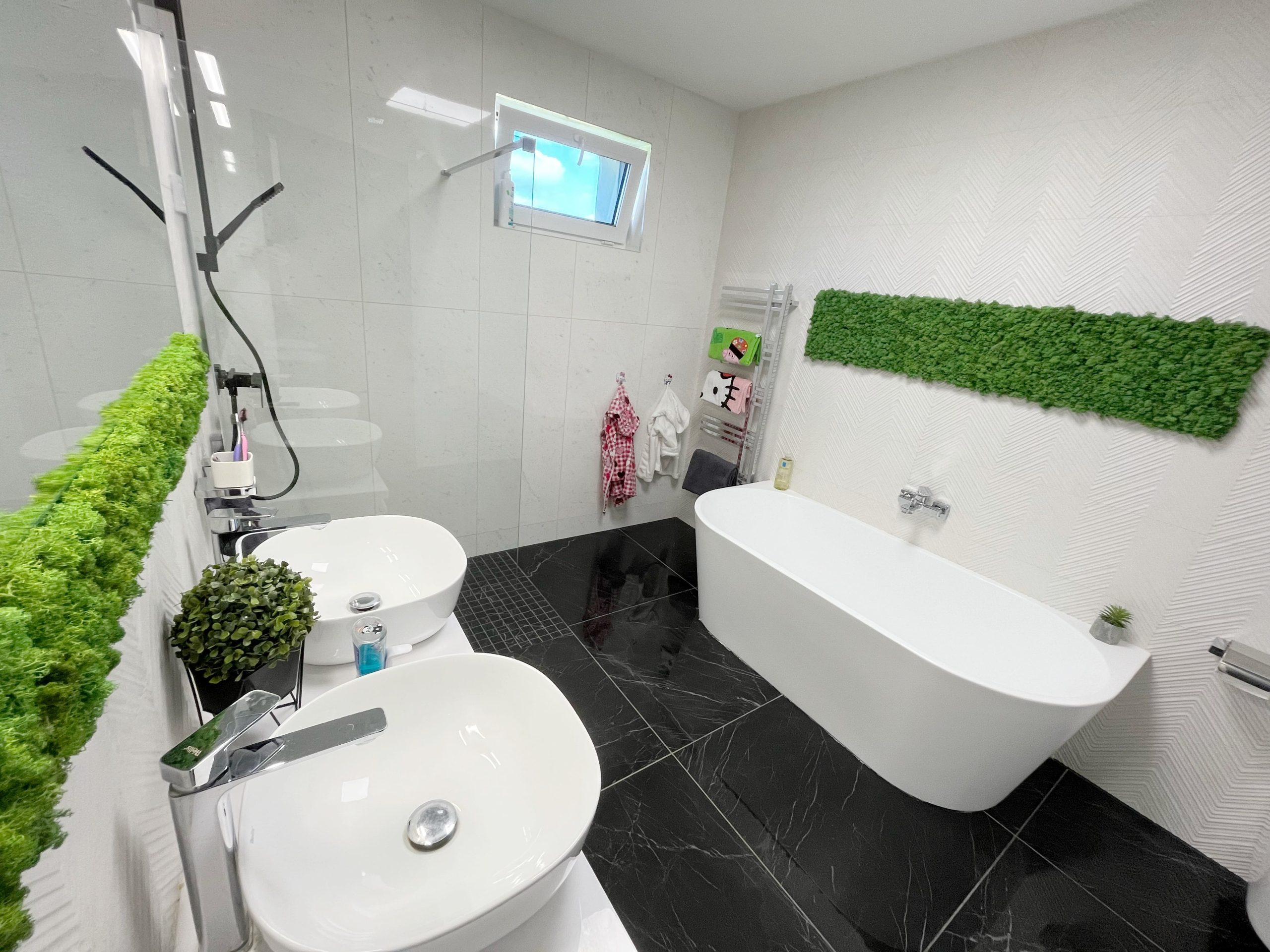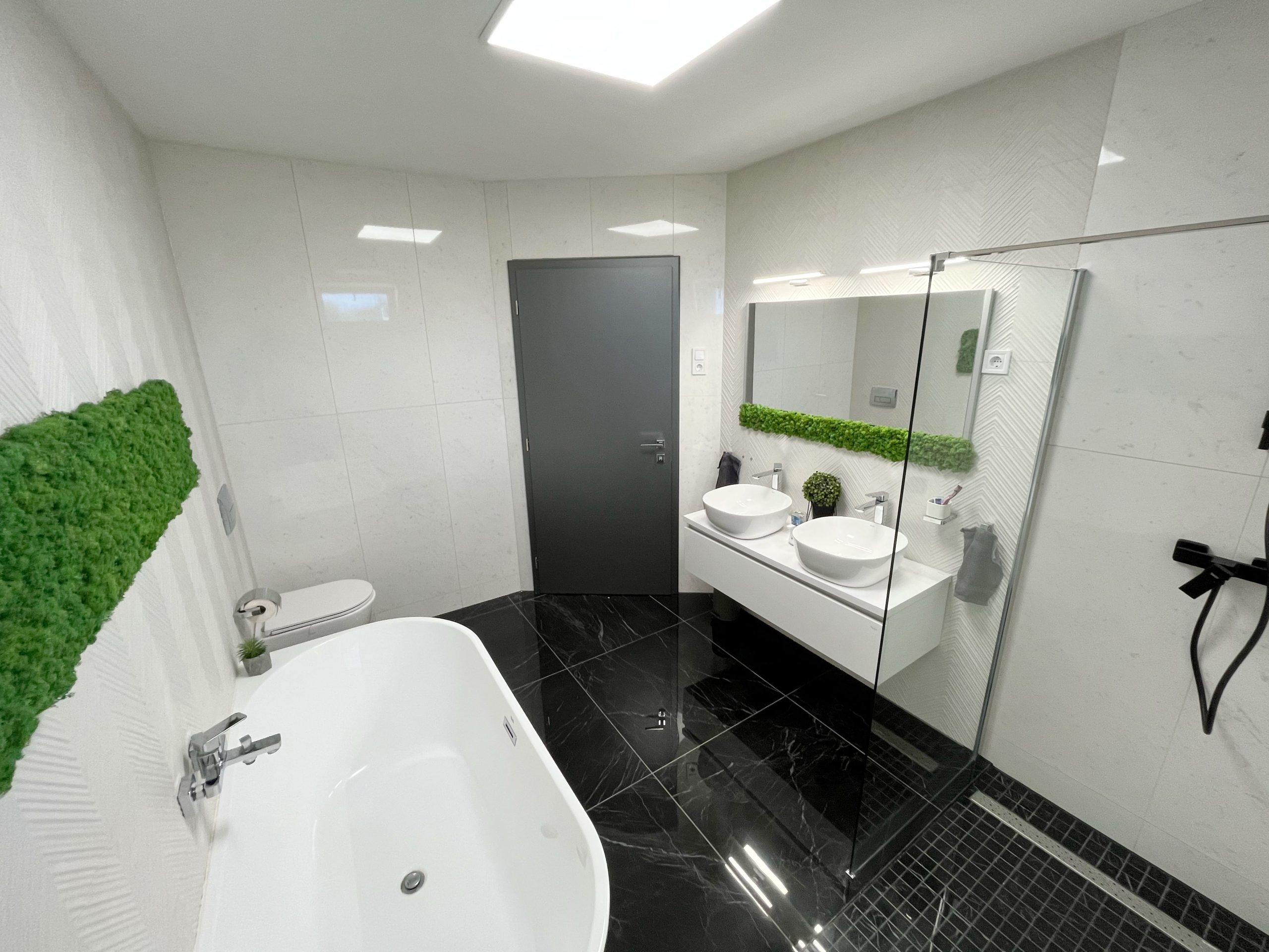 Auf dem Dach finden wir eine 18 kW Photovoltaikanlage, die sogar Elektroautos aufladen bzw. Whirlpool heizen kann. Für die Beschattung sorgen elektrische Rollläden. Das Anwesen ist durch ein Kamerasystem und einen Alarm geschützt.